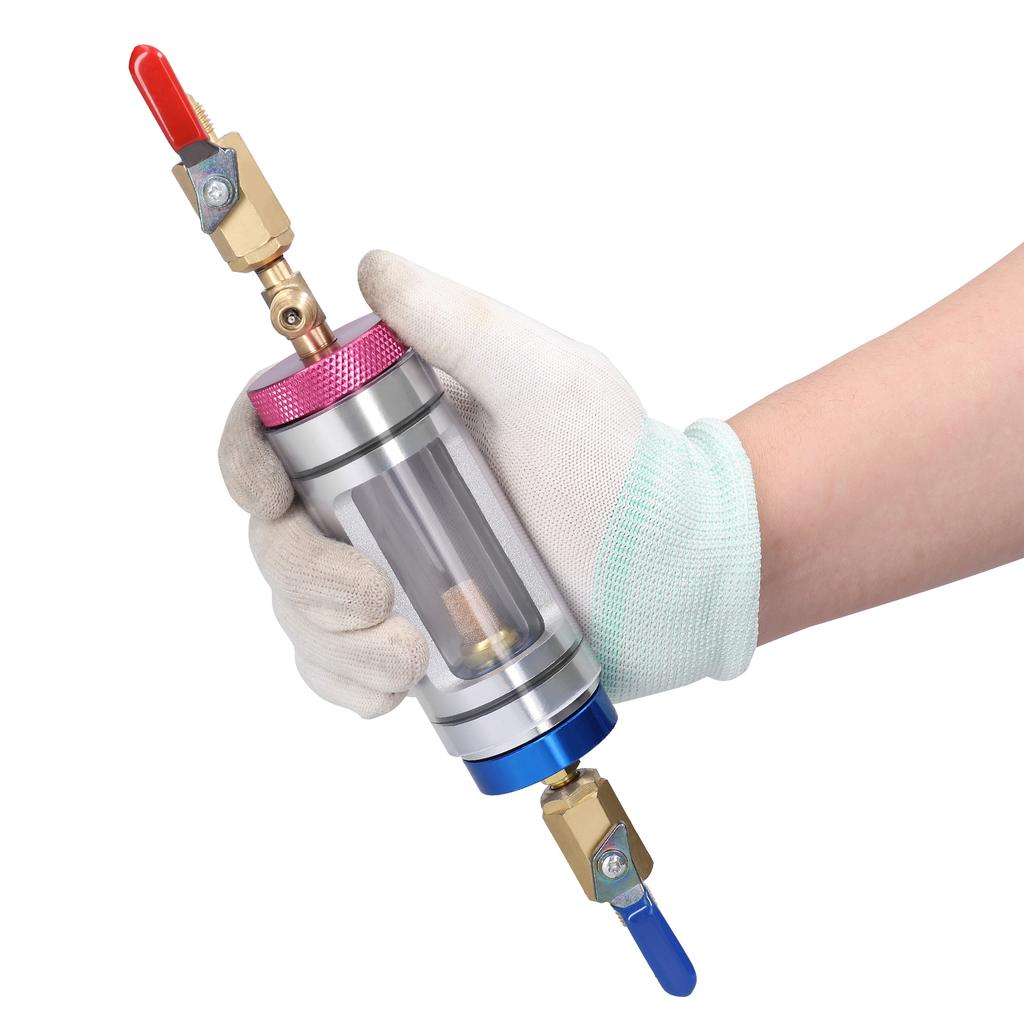 Функция фильтрации и идентификации холодильного масла: Встроенный фильтр высокой плотности, эффективно фильтрующий алюминиевую пудру и примеси в трубопроводе кондиционера, восстанавливающий чистоту холодильного масла в системе и улучшающий охлаждающий эффект кондиционера.. Через 10 минут очистки закройте клапаны высокого давления фильтра и дайте хладагенту вернуться в стеклянную трубку, чтобы оценить качество хладагента.