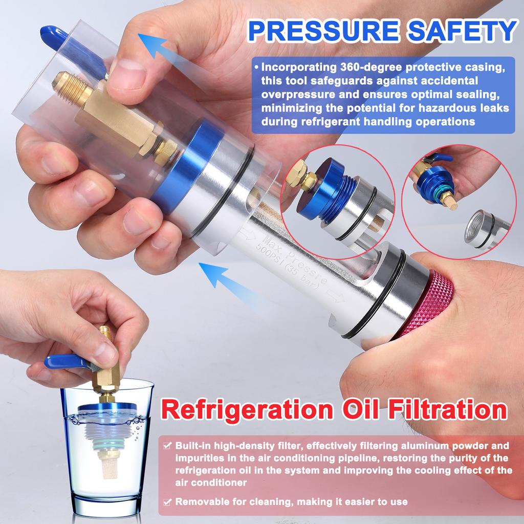 Эффективность и удобство при выполнении задач по техническому обслуживанию: Этот многофункциональный инструмент для заправки холодильного масла, разработанный с учетом оптимизации процессов ремонта автомобилей, обеспечивает более быстрое и безопасное обслуживание благодаря своей прочной конструкции, низкому давлению активации и удобному дизайну, повышающему производительность при выполнении задачи.
