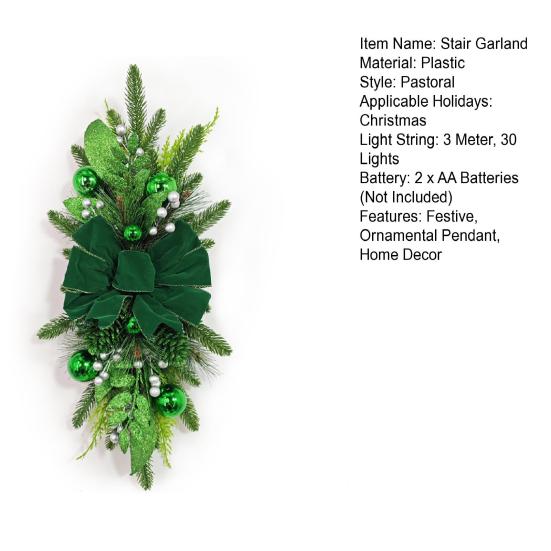 Наша гирлянда, изготовленная из прочного пластика, прослужит долго и не требует специального ухода, что позволит вам использовать ее долгие годы.. Повесьте его на входную дверь, заднюю стену или лестницу и позвольте ему свисать естественным образом, создавая потрясающую и романтическую атмосферу.. Эта искусственная рождественская гирлянда-венок наполнит ваш дом естественной художественной атмосферой.. Это также отличное дополнение к вашей рождественской елке или камину, обогащающее общую праздничную атмосферу.. Эта гирлянда подходит как для внутреннего, так и для наружного использования, идеально подходит для Рождества, свадеб и других случаев.. Украсьте свои стены, окна, гостиную, спальню, столовую, веранду и многое другое этой забавной и привлекательной гирляндой.. Создайте рождественскую сцену в скандинавском стиле с помощью наших драпировок для украшения лестниц.. Украсьте свой праздничный декор нашей лестничной гирляндой и сделайте это Рождество по-настоящему волшебным.