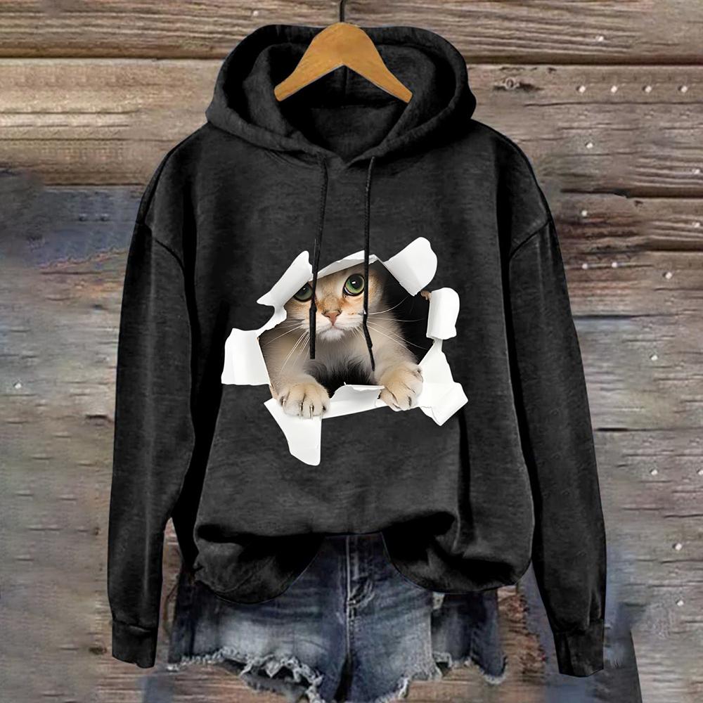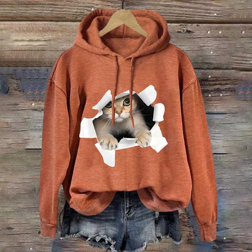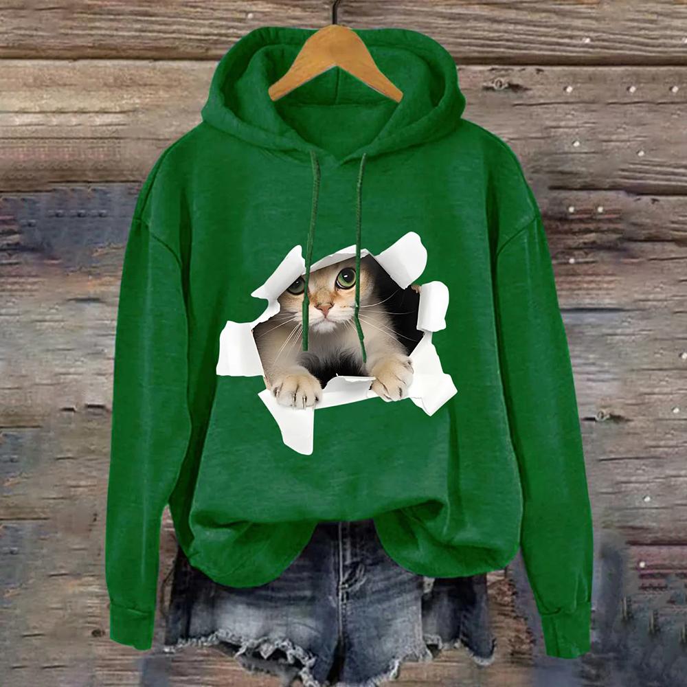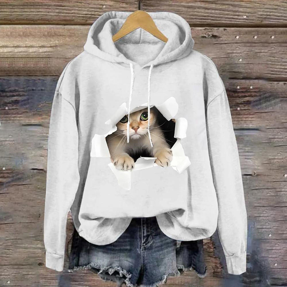 Милый принт с кошкой Женская толстовка с капюшоном Осенняя мода Уличная женская толстовка с круглым вырезом Повседневная свободная женская одежда Y2K Топы Толстовки