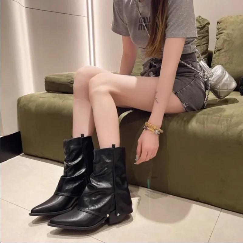 Мода 2024 года. Дизайн бренда. Острый нос. Квадратный каблук. Зимние высокие ботинки. Лаконичные офисные женские туфли. Плиссированные зимние сапоги из шелка.