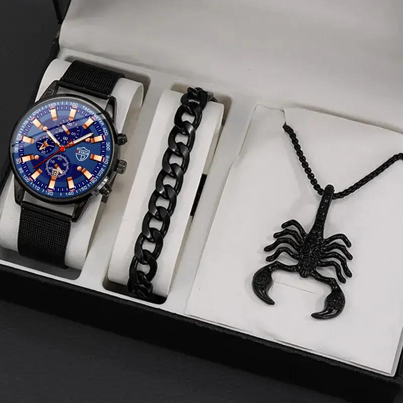 3pcs/set Fashion Men's Business Stainless Steel Mesh Band Quartz Watch & Bracelet Neckalce Set