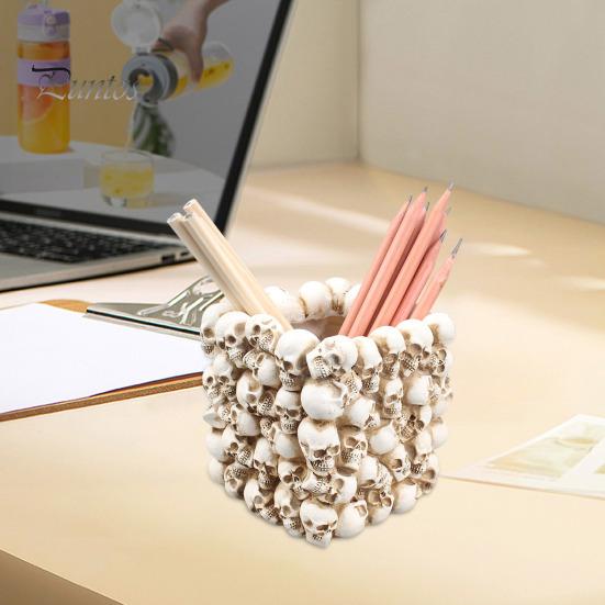 Представляем держатель для ручек в форме черепа — уникальное и универсальное решение для хранения на рабочем столе, которое добавит нотку ретро-креативности любому пространству.. Изготовленный из прочной смолы, этот держатель в форме черепа не только является органайзером для ручек и кисточек для макияжа, но также идеально подходит для хранения ключей, телефонов и многого другого.