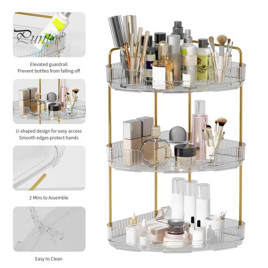 Наш трехъярусный органайзер имеет гибкий размер и конструкцию с углом наклона 90 градусов, подходящую для различных пространств за пределами ванной комнаты.. Украсьте свою кухню, спальню или туалетный столик этим универсальным решением для хранения, которое добавит элегантности любому уголку вашего дома.