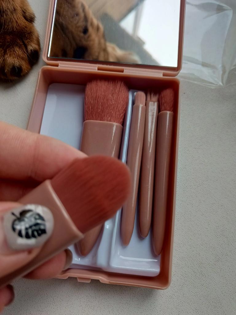 Макияж бывает нужен даже на отдыхе и очень удобно иметь под рукой кисти для косметики. Доставка составила около месяца. При транспортировке ничего не повредилось и набор пришел без брака. Кисти приходят в специальной коробке. В ней есть зеркало, лоток под сами кисти. В комплекте 5 разных кистей. Все они небольшого размера, ворс мягкий и косметику наносят как следует. Такой набор удобно брать с собой на отдых или в командировку. Покупкой осталась довольна. А еще такой набор будет интересным вариантом для подарка. К приобретению рекомендую.