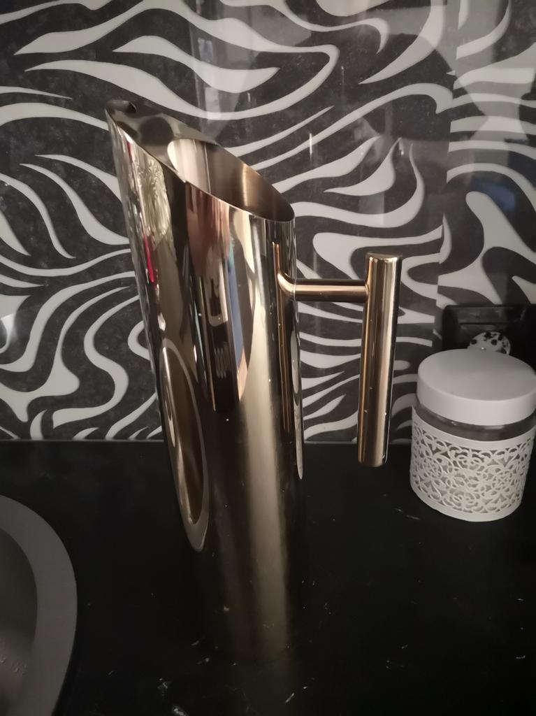 Улучшите процесс сервировки с помощью гладкой зеркальной поверхности этой бутылки.. Полированный внешний вид добавит элегантности любому интерьеру, сделав его стильным дополнением к вашей коллекции.. Зеркальная отделка также гарантирует, что этот золотой кувшин для сока сохранит свой новый вид в течение длительного времени.