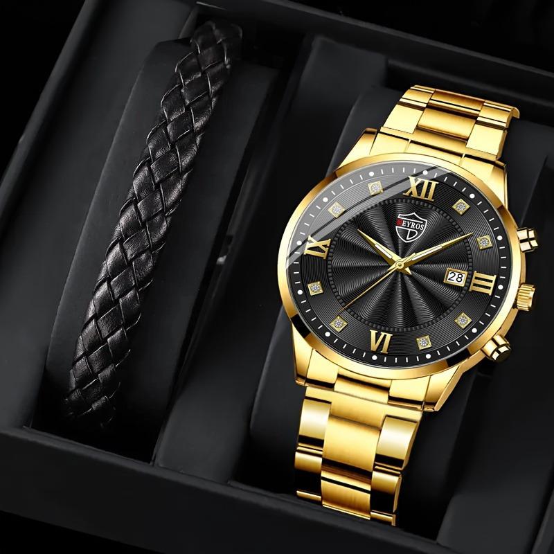2pcs/set, Men's Fashion Stainless Steel Quartz Watch & Analog PU Leather Bracelet Set, Men's Gifts — купить товар онлайн с бесплатной доставкой по всему миру!