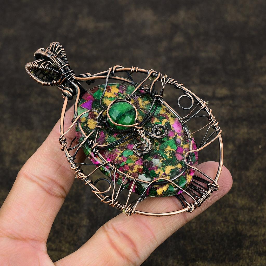 Медь Рубин Цоизит Лабораторно выращенный Ручная работа Медная проволока Оплетка Подвеска 3,82" g2j45