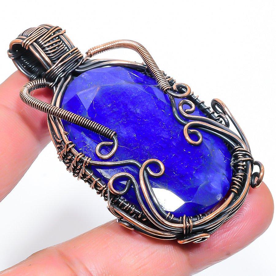 Сапфир Натуральный Драгоценный Камень Ручной Работы Медная Оплетка Кулон 2,44" p9D16