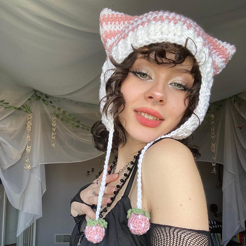 Женская шерстяная шапка с клубничным ремешком и кошачьими ушками в полоску, трикотажная защитная шапка для ушей, защищающая от холода — купить товар онлайн с бесплатной доставкой до всему миру!