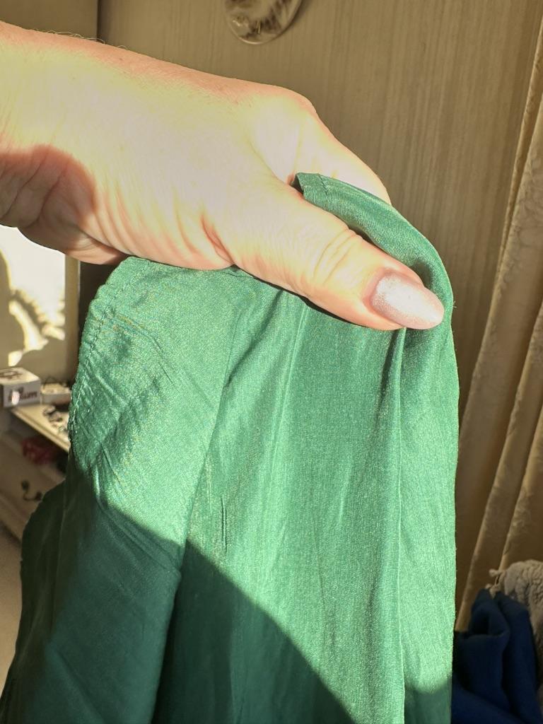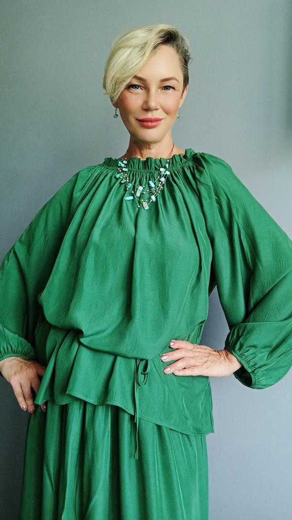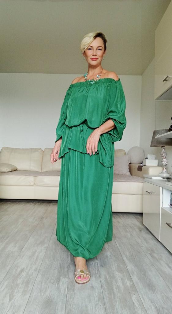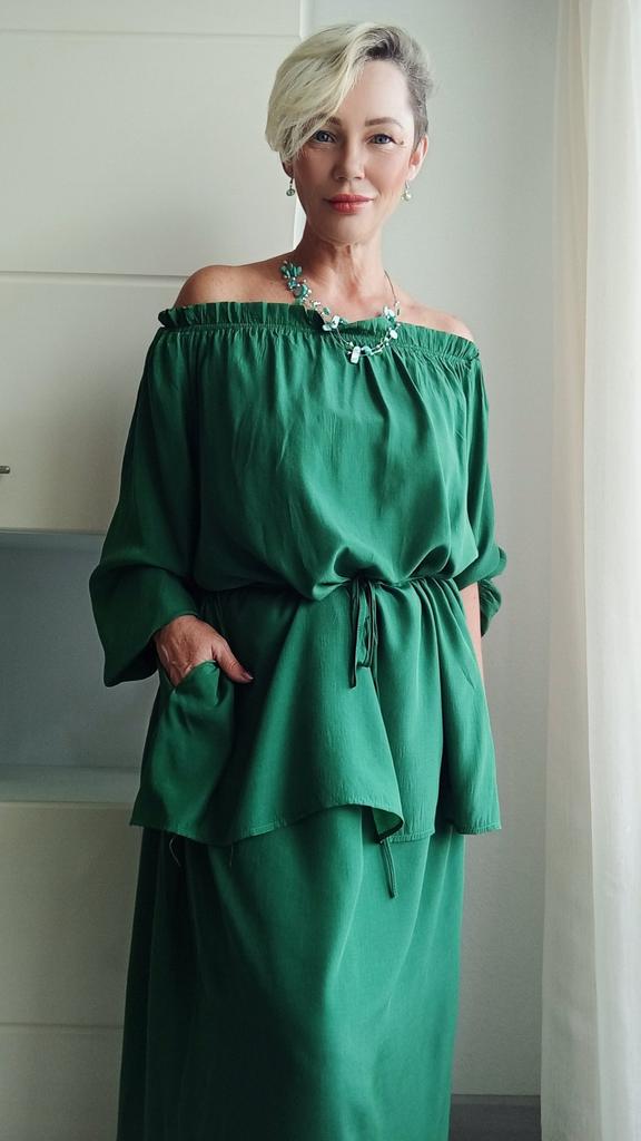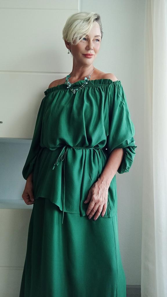 Зелёный костюм с юбкой 📌Размер единый. Мои параметры : 167, 96-82-98. Костюм состоит из двух предметов: широкая, свободная блуза и широкая юбка в пол. 📌У блузы наверху резинка, и носить ее можно так, как вам удобнее: можно сильно (или не очень) оголить плечи, или не делать этого). Рукава широкие, внизу с тонкими манжетами без резинки. Блуза прямого силуэта, в комплекте тонкий пояс, для которого предусмотрены шлевки. Имеются карманы. Юбка прямая и широкая, на талии резинка. 📌Ткань нежная, мягкая, не тянется, не электризуется, не просвечивает. Заявлен полиэстер. Удивлена. Думала, что присутствует натуральное волокно. Ни бирок, ни этикеток на моем экземпляре нет, поэтому полагаюсь на описание. Пошив аккуратный. 📌Замеры. Блуза: 📐Плечи нет Длина рукава от горловины 65 Длина рукава от подмышки 43 Ширина рукава вверху 26 ОГ подмышками 144 ОТ 152 ОБ 160 Длина 72 Юбка: ОТ 70-120 ОБ 180 Длина 95