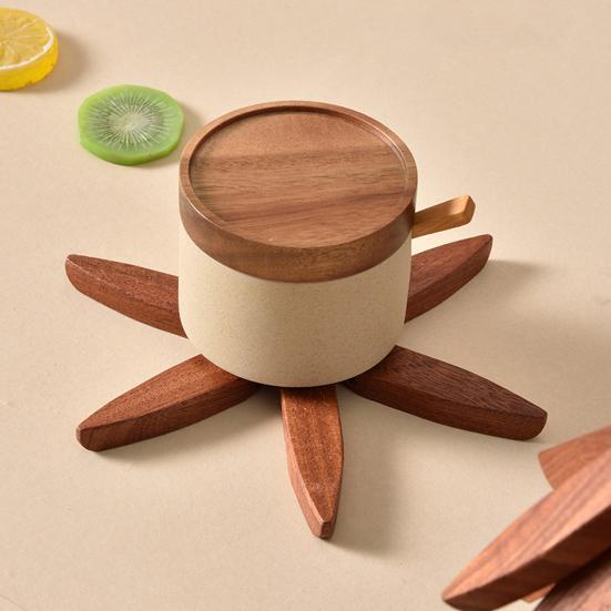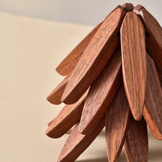 Набор треугольных ковриков: Этот комплект деревянных треугольных салфеток под приборы включает в себя четыре деревянных треугольных коврика и один кронштейн, обеспечивая стильное и функциональное решение для защиты столешниц и столов от теплового повреждения, а также добавляя нотку естественной элегантности любой столовой или кухне.