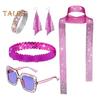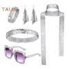 Подчеркните свой гламур с помощью этого изысканного комплекта украшений, изготовленного из высококачественного металла и украшенного ослепительными блестками и стразами.. В комплект входят повязка на голову, шарф, солнцезащитные очки, браслет со стразами и серьги, всего пять штук..