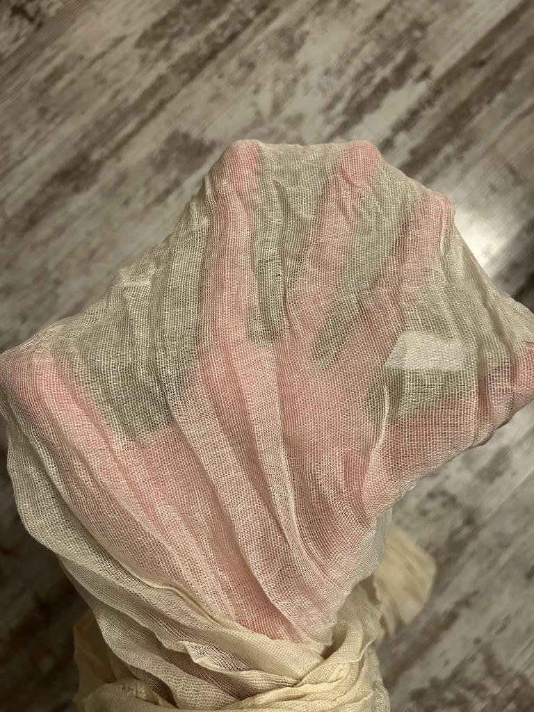Мягкий, тонкий, после стирки цвет и размер не изменились. Многофункциональная вещица. Можно использовать и как шарф и как палантин. Можно сушить в расправленном или скрученном виде, тогда получается разная фактура, или сочетать в двух разных цветах.