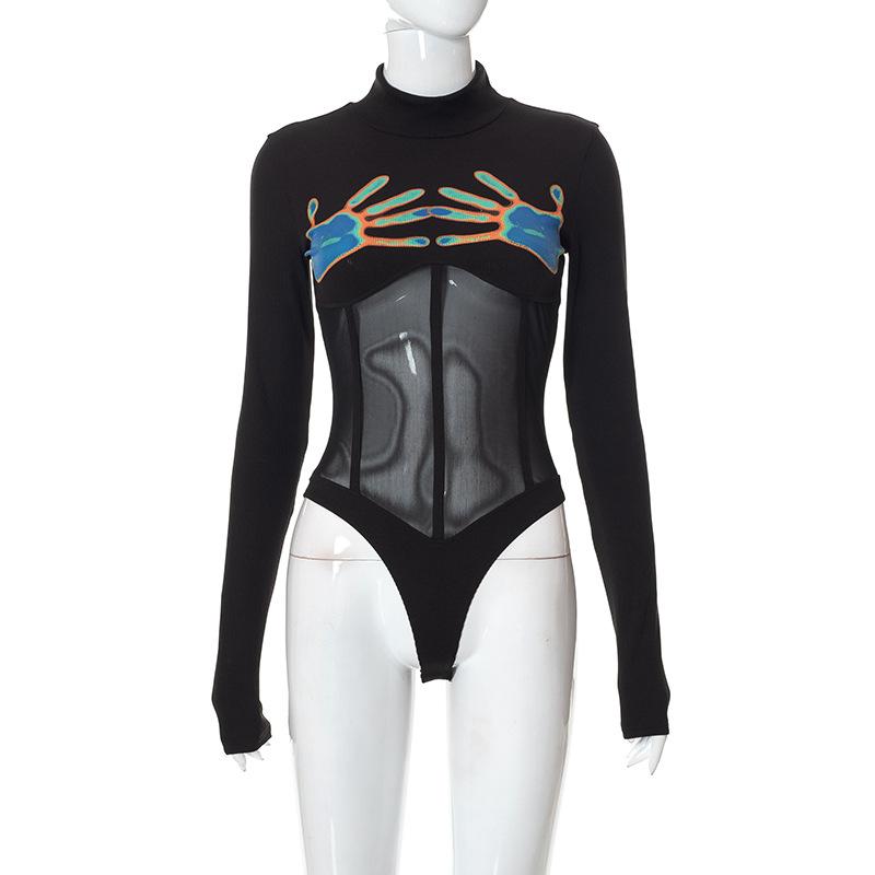 Летний женский комбинезон Y2K с круглым вырезом и длинными рукавами из сетчатого материала с принтом