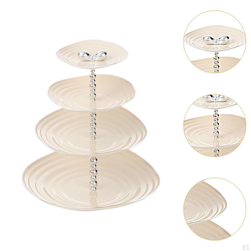 - 【Четырехуровневая конструкция】: Фруктовая тарелка имеет 4-ярусную конструкцию большой вместимости, идеально подходящую для демонстрации различных закусок, пирожных, фруктов, орехов и других продуктов.. Он оснащен переносной ручкой для удобной переноски.