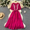Винтажное платье с круглым вырезом для женщин с рукавами-фонариками, вышитыми шнуровкой, платья А-силуэта, однотонные лоскутные пуговицы, летнее платье