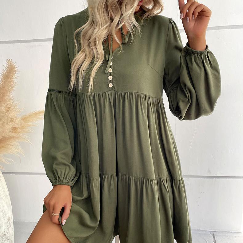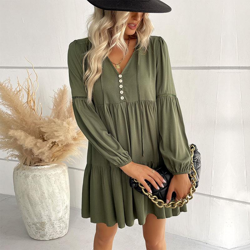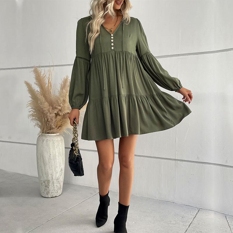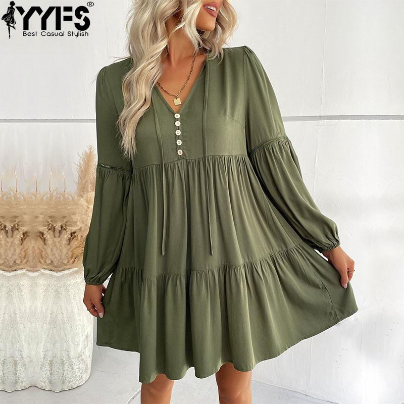 YYFS Женская мода весна осень однотонный принт с длинным рукавом с v-образным вырезом свободная талия повседневные платья