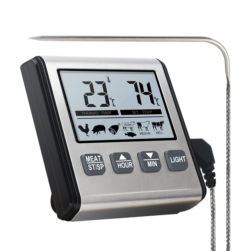 (3) Настройка температурного сигнала: Вставьте зонд в пищу, температура пищи отображается на левой стороне ЖК-дисплея, а на правой стороне - предустановленная температура тревоги. Нажмите клавишу ▲▼, чтобы отрегулировать температуру тревоги вверх, Когда текущая температура больше или равна значению температуры тревоги, сигнал тревоги зазвонит, и подсветка будет мигать одновременно. Нажмите кнопку MEAT, чтобы остановить будильник;