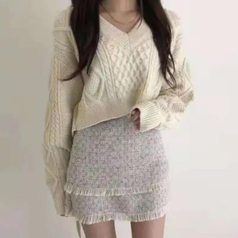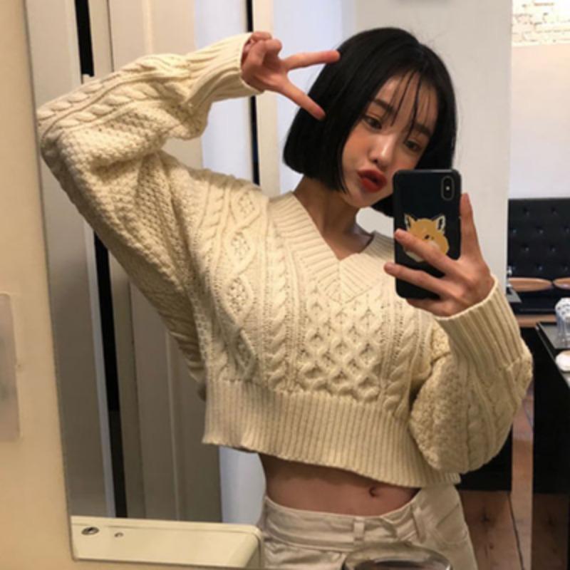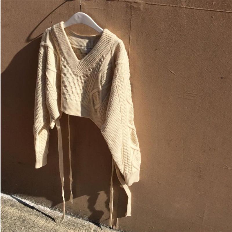Корейская мода сексуальный короткий свитер со шнуровкой сзади на осень-зиму с длинным рукавом, вязаный свитер с V-образным вырезом, однотонные свободные топы, элегантная одежда 1406