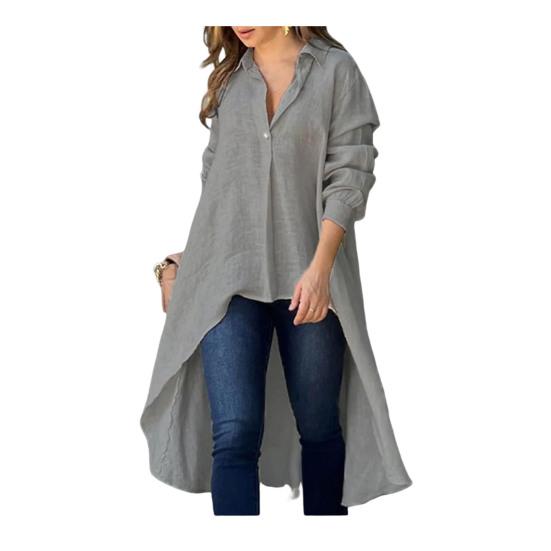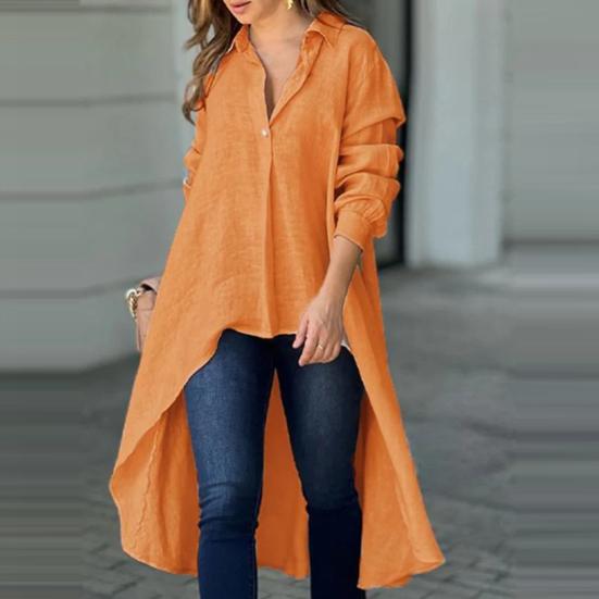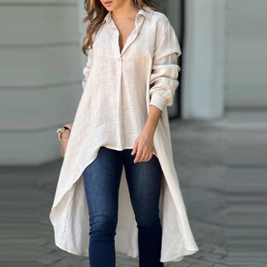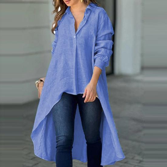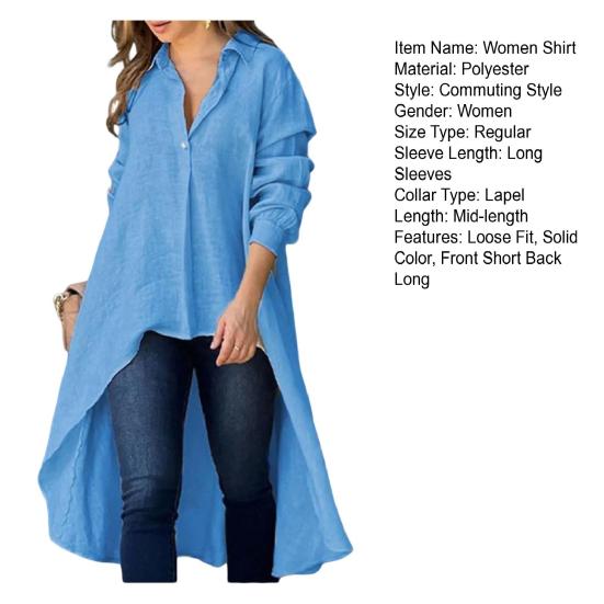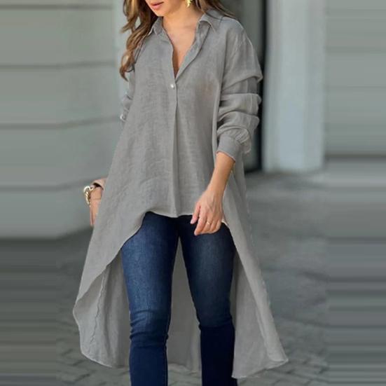 Улучшите свой гардероб с помощью этой незаменимой женской рубашки, созданной для создания шикарного и непринужденного стиля, которая подойдет к любой фигуре.. Эта рубашка однотонного цвета с лацканами и длинными рукавами имеет элегантный неровный подол, короче спереди и длиннее сзади, что придает вашему образу нотку изысканности..