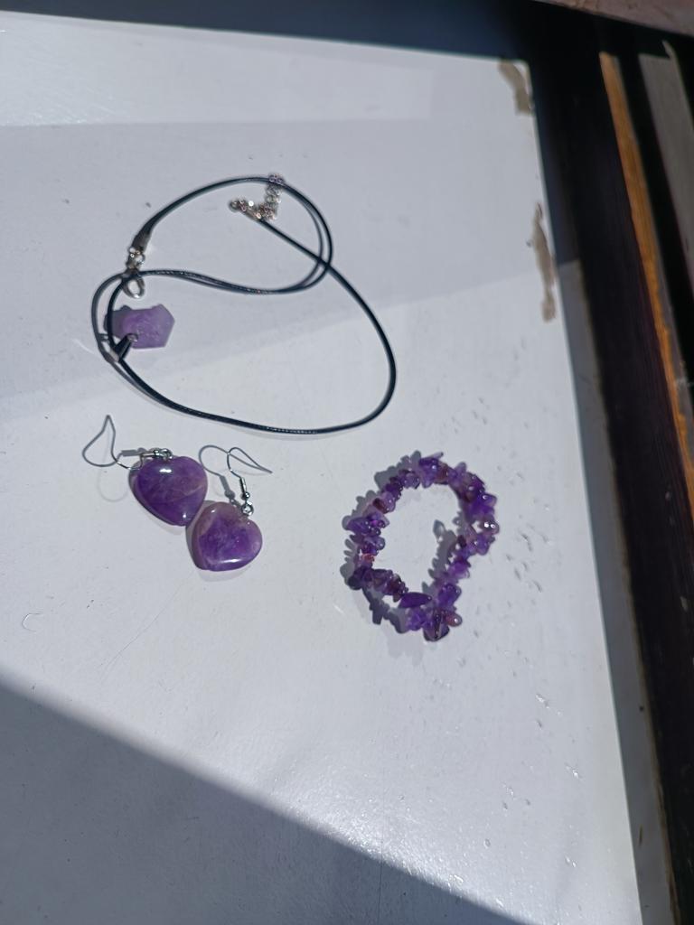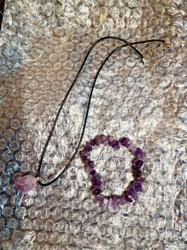 Комплект пришёл без повреждений. Камешки браслета яркие, отшлифованы. Браслет на резинке. Камень - кулон без обработки на шнурке. Оригинальное решение. Спасибо за изготовление и доставку.