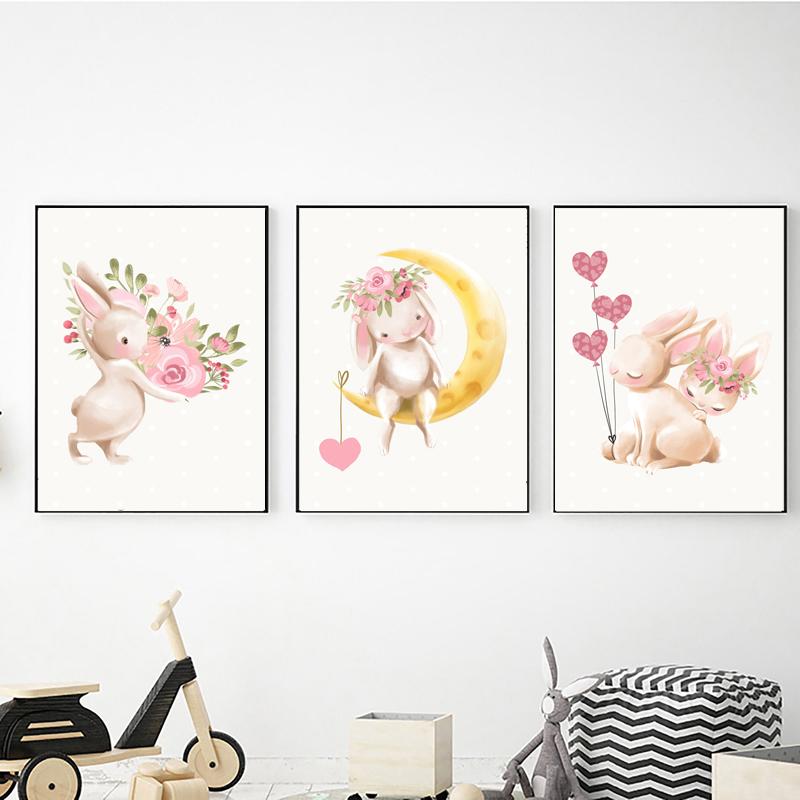 Мультфильм милый кролик держит цветы луна любовь детские плакаты и принты настенное искусство холст картины настенные картины декор детской комнаты без рамки