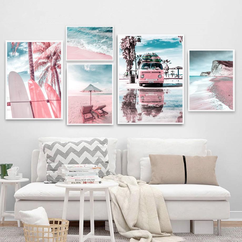 Розовый пляж морской пейзаж постер холст настенное искусство скандинавские скандинавские картины для интерьера отпуск фотографии для дизайна дома без рамки