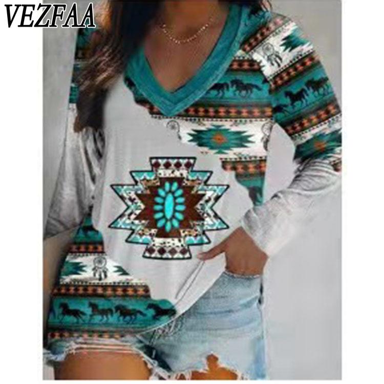 VEZFAA Женская мода повседневная весна осень геометрический принт длинный рукав V-образный вырез блузки и рубашки — купить товар онлайн с бесплатной доставкой по всему миру!