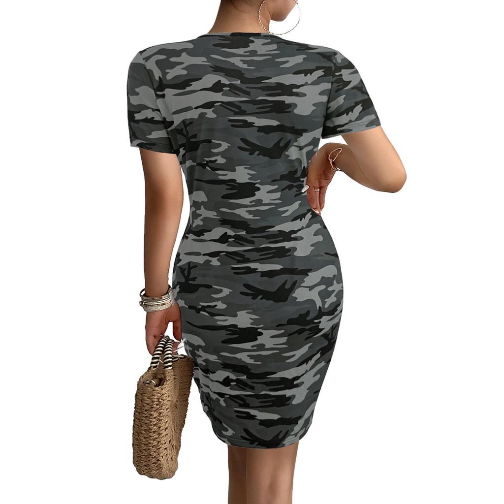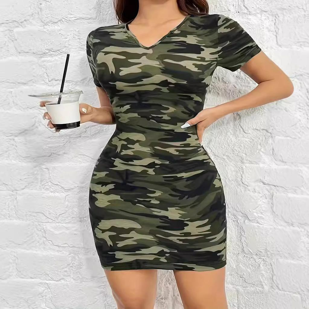 Женское повседневное облегающее короткое платье с короткими рукавами и V-образным вырезом с камуфляжным принтом