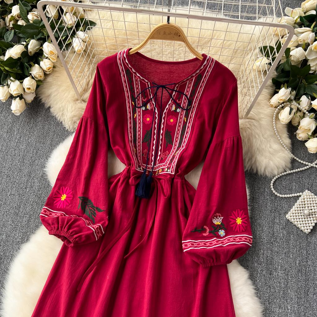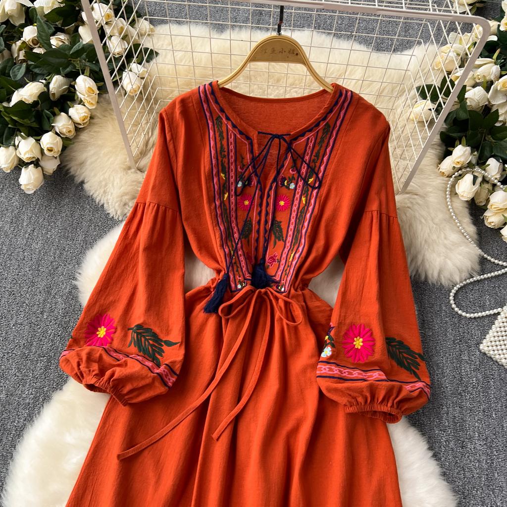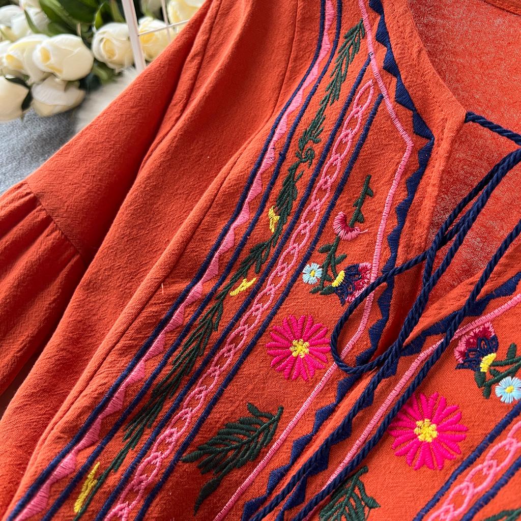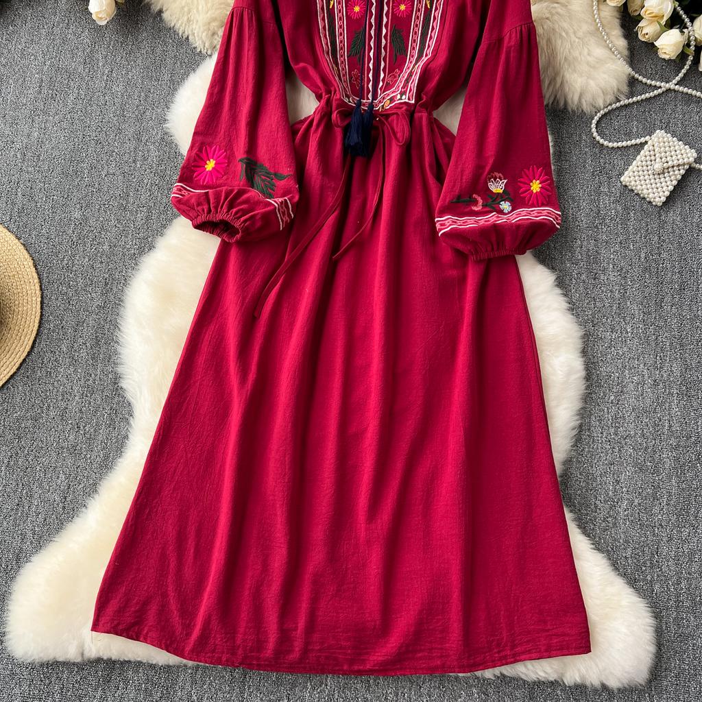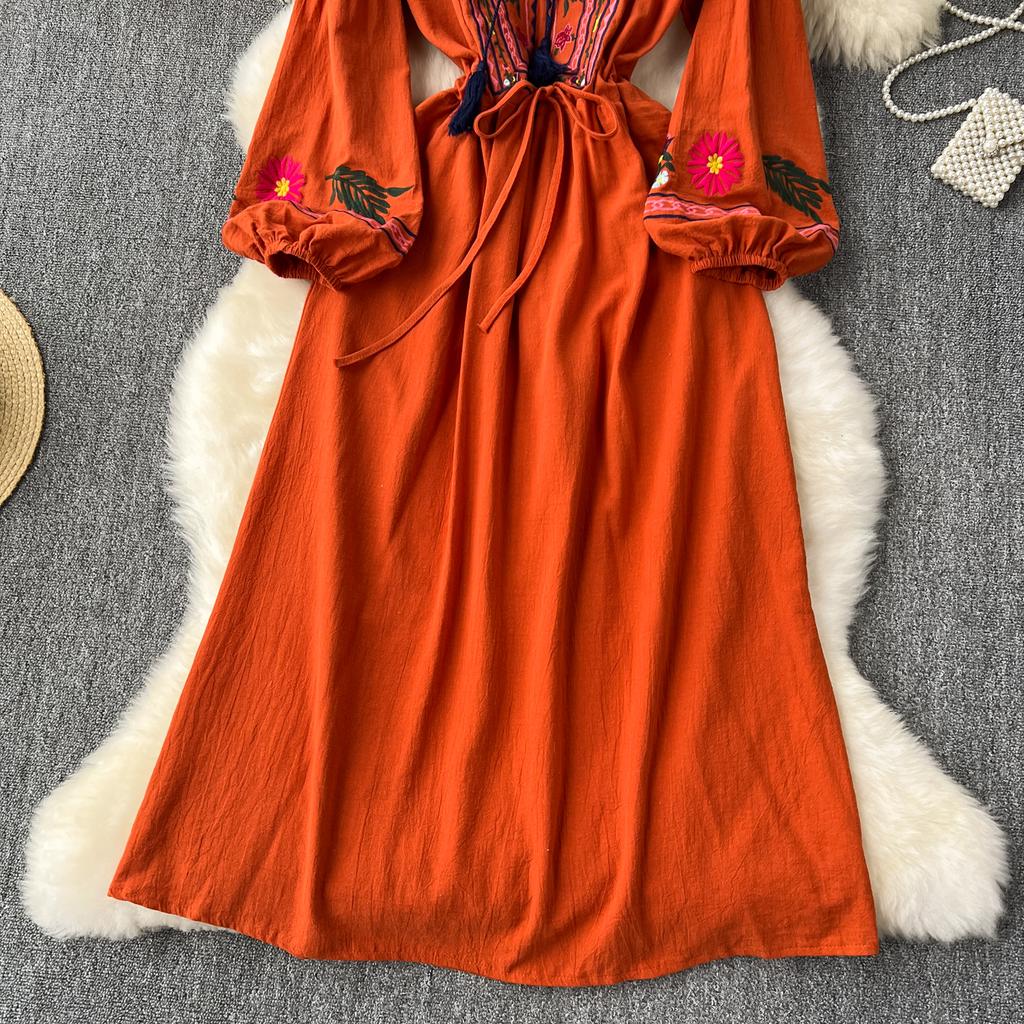 Винтажное элегантное платье с V-образным вырезом и вышивкой, рукавами-фонариками, повседневное платье-трапеция для женщин, модное летнее весеннее платье-платье