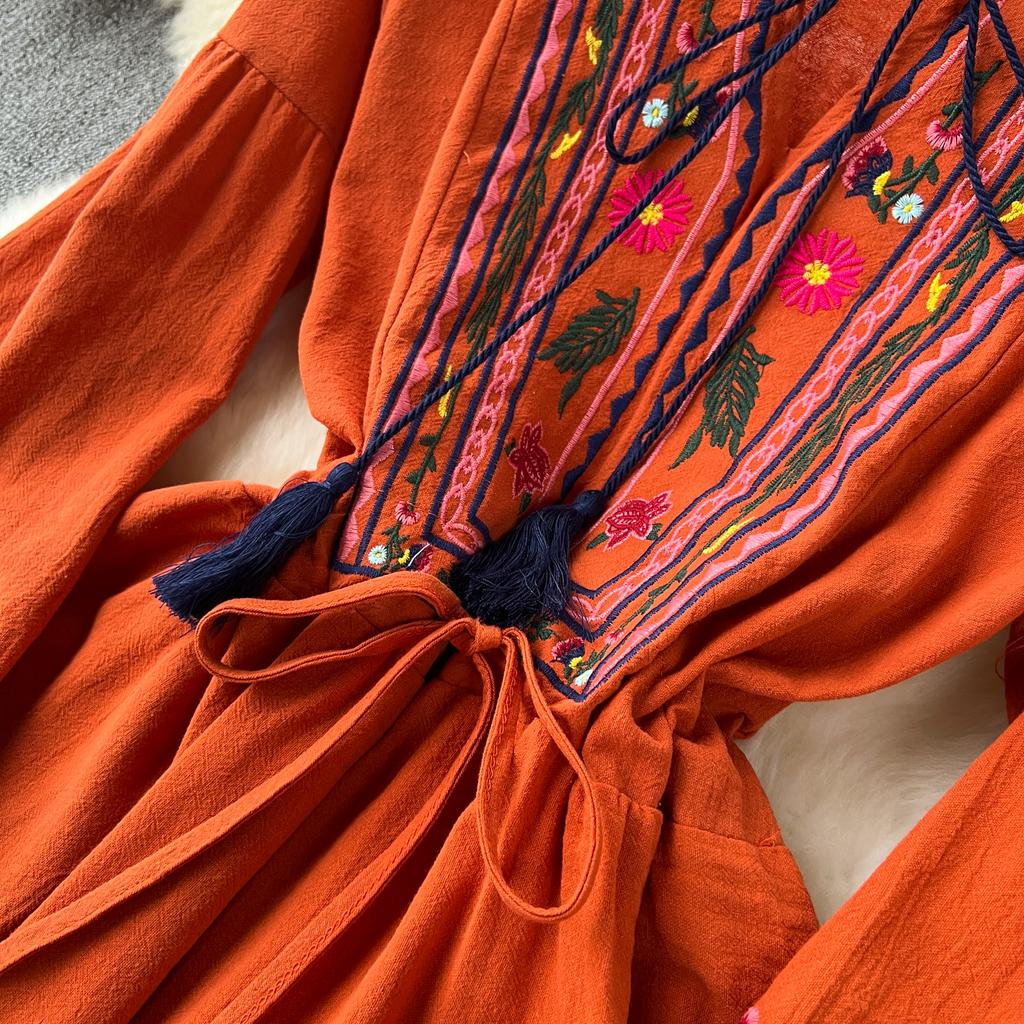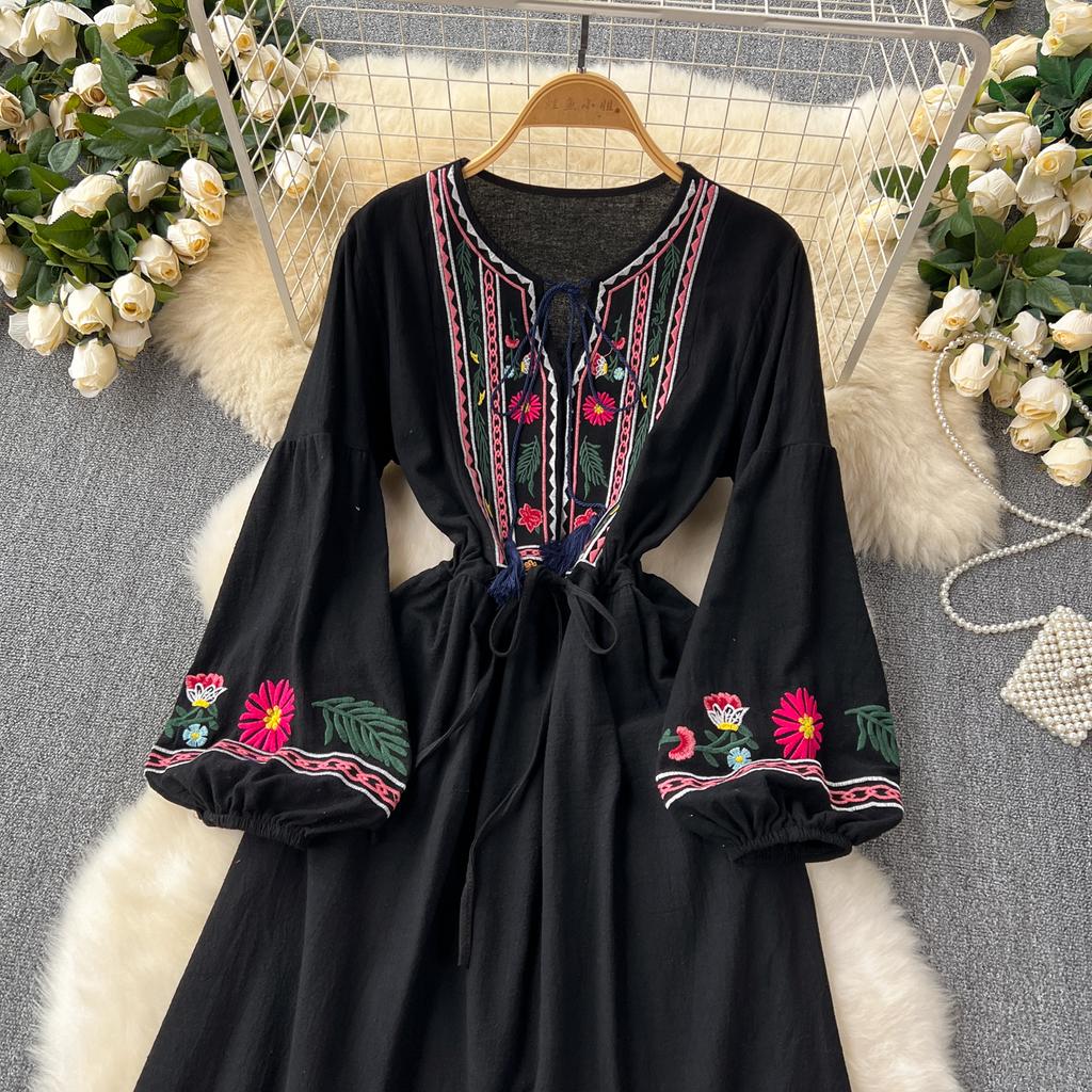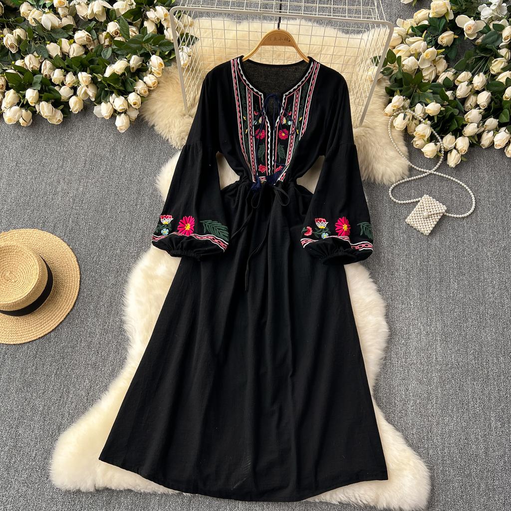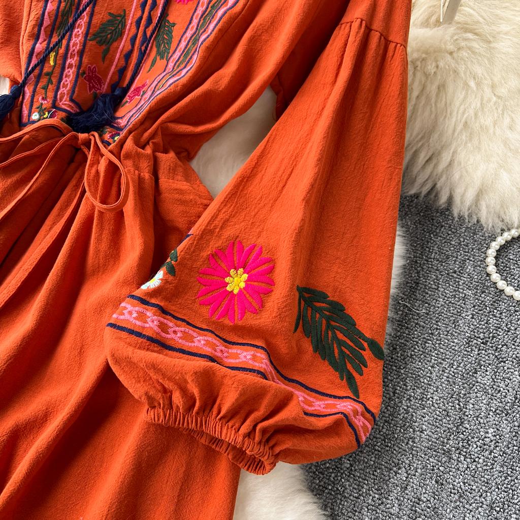 Винтажное элегантное платье с V-образным вырезом и вышивкой, рукавами-фонариками, повседневное платье-трапеция для женщин, модное летнее весеннее платье-платье