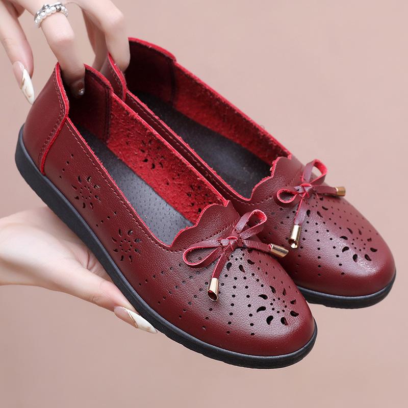 Босоножки для мам. Женская весенняя и летняя обувь. Кожаная обувь на плоской подошве для людей среднего возраста и пожилых людей. Нескользящая мягкая подошва. Туфли с отверстиями для людей среднего возраста.
