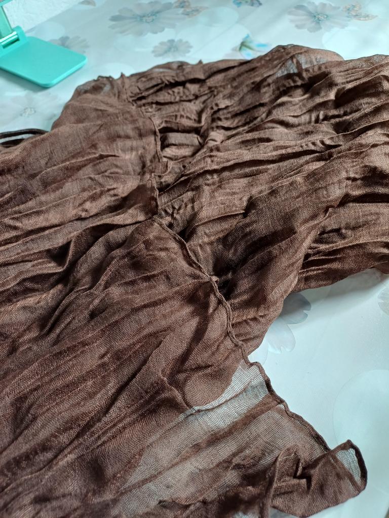 Шарфик прозрачный, тоненький, к телу приятный, ловит статику, по цвету немного светлее фото продавца, но цвет благородный. Шарф окрашен ровно. Приехал смотанный в тугой жгут, потому "плиссированный" ). Как я понимаю, постирать, погладить - фактура уйдёт. Чтобы он был стильно мятый, придётся отпаривать именно в жгуте. Запахов не имеет.