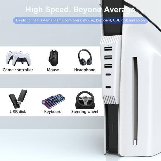 Расширьте свои игровые возможности с помощью USB-разветвителя, разработанного для консоли PS5 Slim.. Этот 5-портовый концентратор оснащен 3 портами USB, 1 портом Type-C и 1 портом Type-C 3.1, что позволяет подключать несколько устройств одновременно..