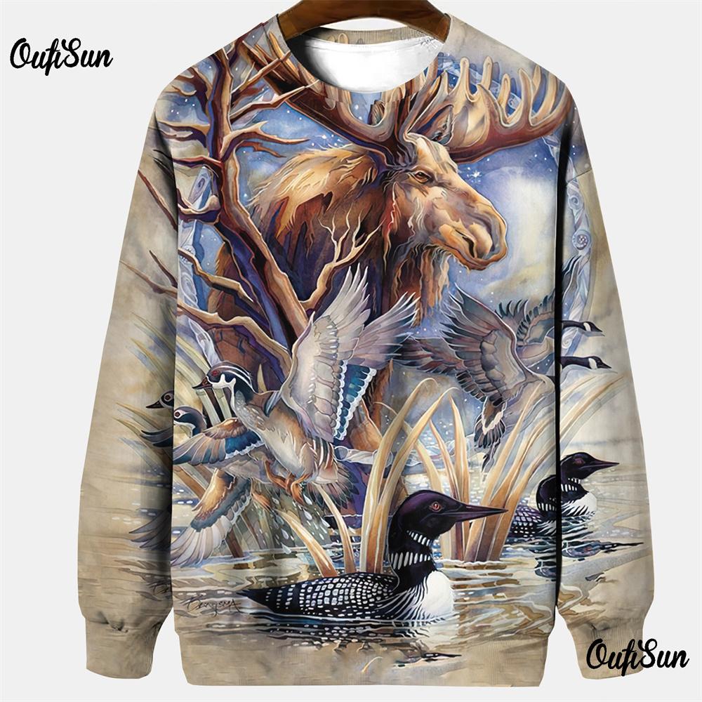 Толстовки с капюшоном для охоты для мужчин, одежда для активного отдыха, футболка с принтом лося 3D, свободный топ с длинным рукавом и круглым вырезом, мужской камуфляж