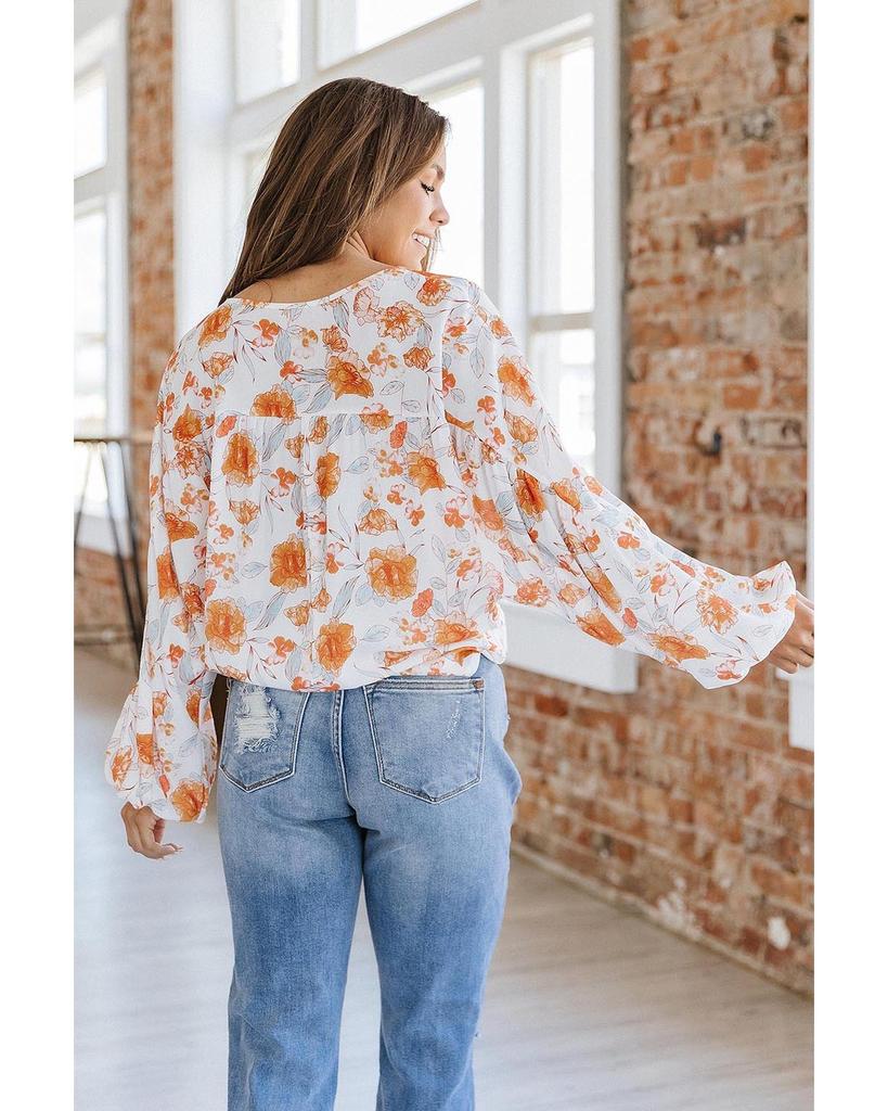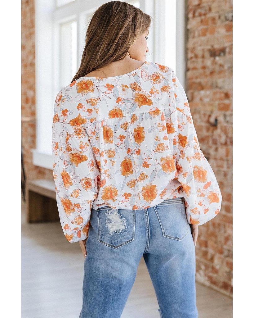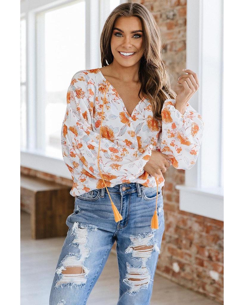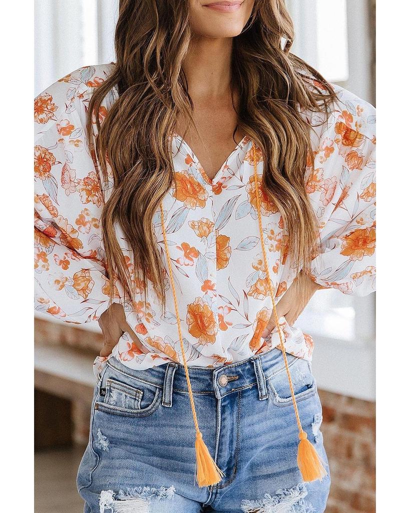 Azura Exchange Белая блузка с V-образным вырезом, завязками-кисточками и рукавами-фонариками, цветочным принтом