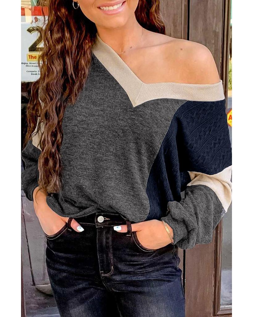 Azura Exchange Черный матовый контрастный трикотажный топ с V-образным вырезом, колор-блок, длинный рукав