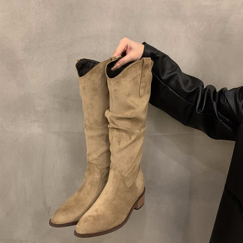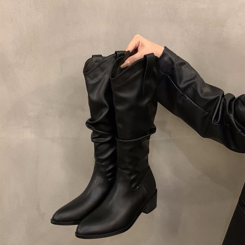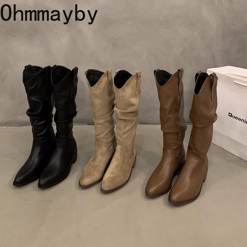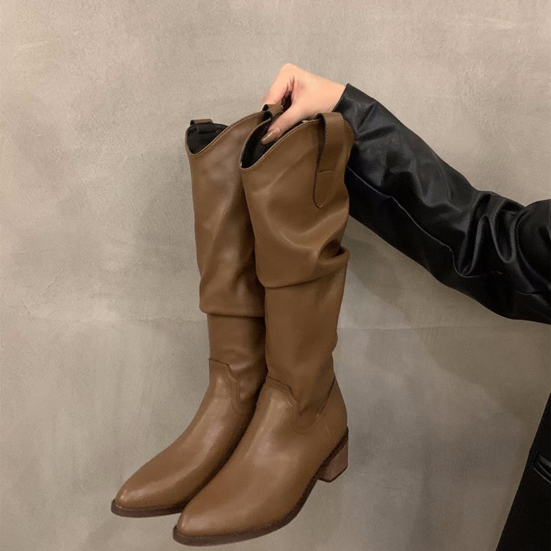 Мода Ретро Стиль Женщины Вестерн ковбойские сапоги Модные туфли без застежек Осень Зима Квадратный Низкий Каблук Дамы Рыцарь Длинные сапоги