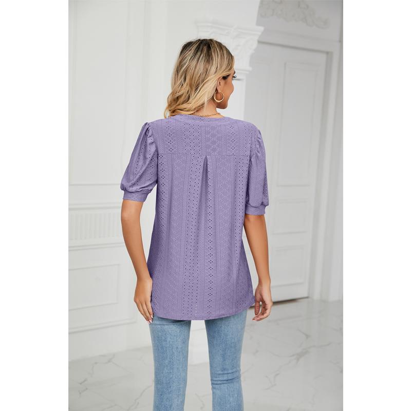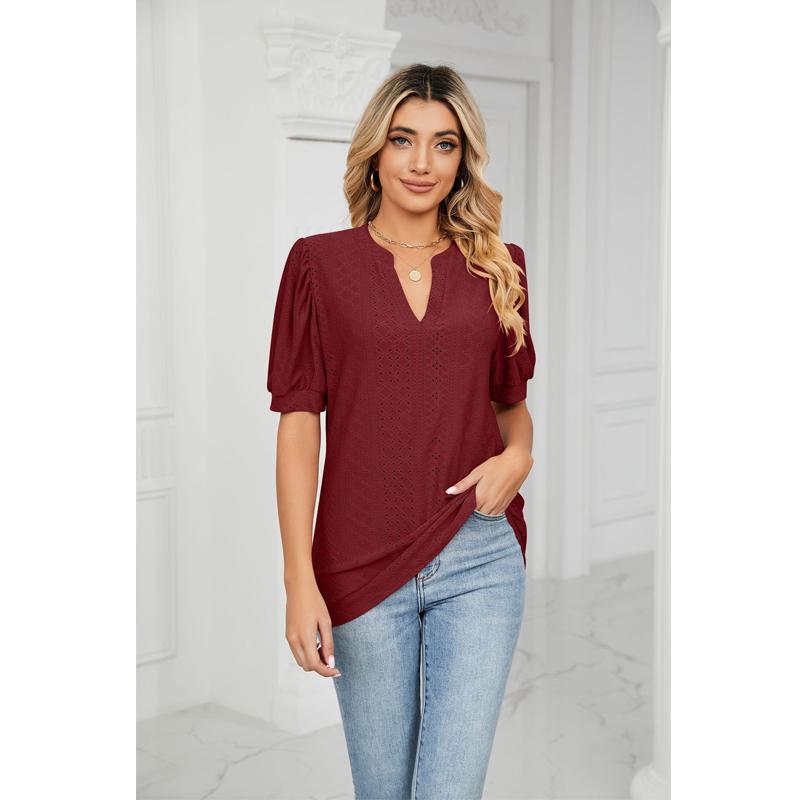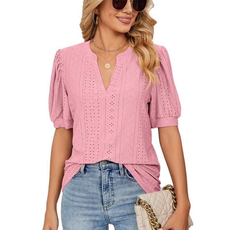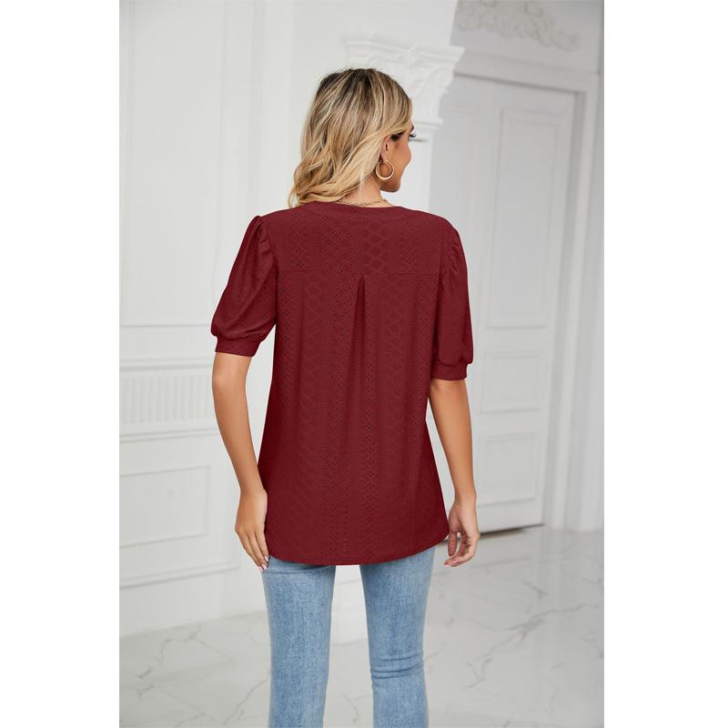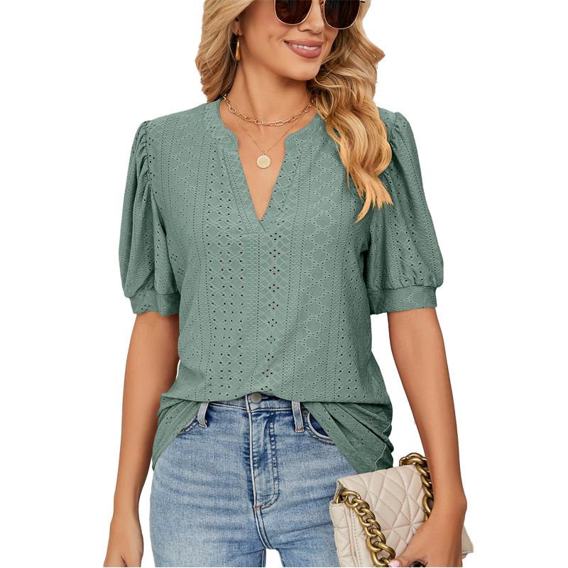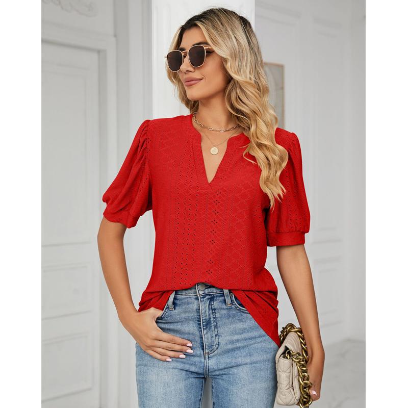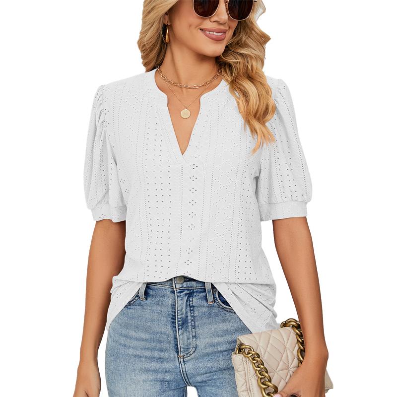 Женская футболка с коротким рукавом, летние повседневные однотонные свободные топы с V-образным вырезом и ажурными буфами