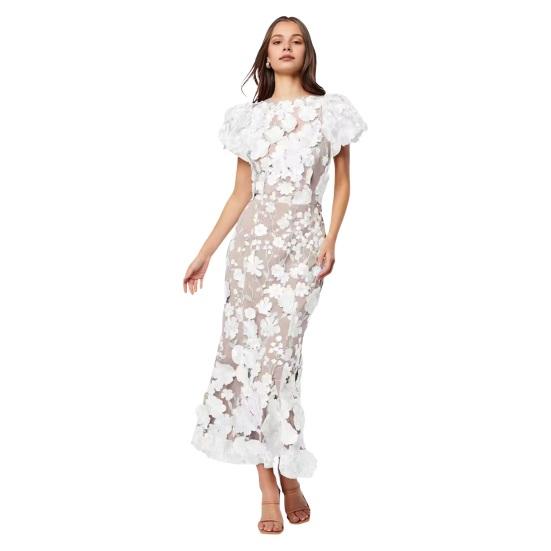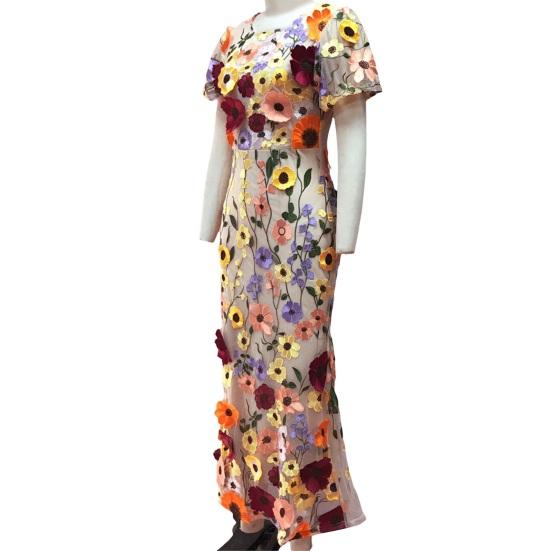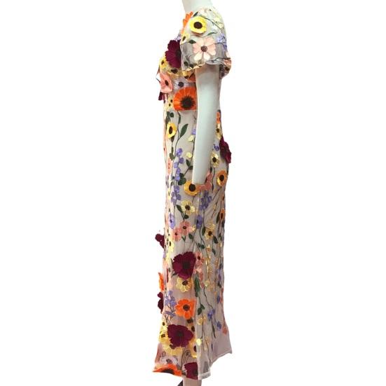 Подчеркните свой стиль с помощью этого изысканного женского платья, украшенного яркими трехмерными цветами.. Это милое и элегантное платье с круглым вырезом, рукавами-буфами и привлекательным дизайном «рыбий хвост», прикрывающим бедра, красиво украшено замысловатыми вышитыми цветами..