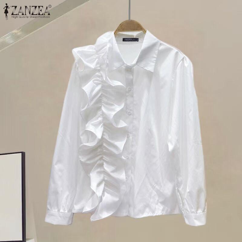 ZANZEA Женская повседневная однотонная рубашка с длинным рукавом и оборками