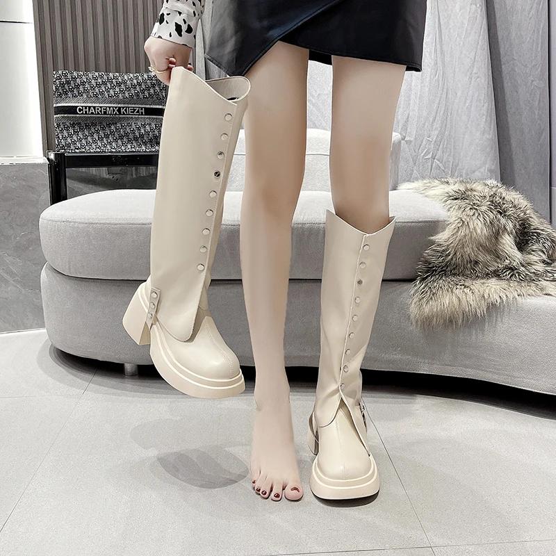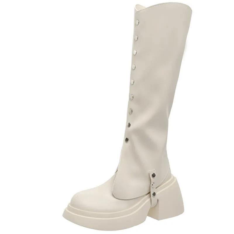 Мода Женщины Мотоцикл Длинные Ботинки Осень Зима Заклепки Сапоги До Колена Кожаные Ботинки Женские Ботинки На Толстой Подошве Платформа Botas Mujer Высокие Каблуки