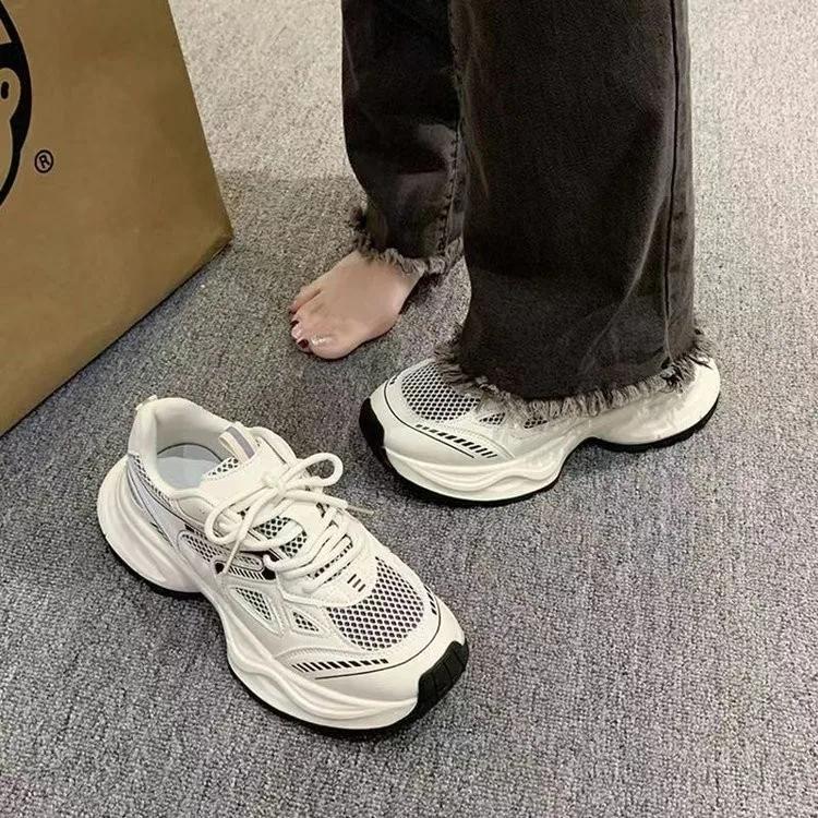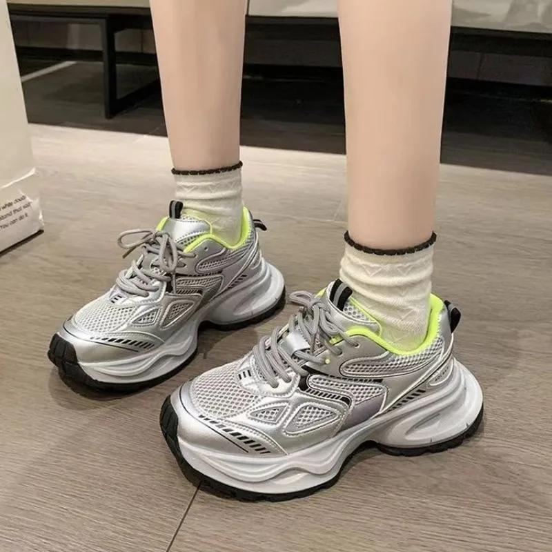 Модные дышащие туфли для папы из серебристо-серой сетки для женщин 2024 года, весна, новые легкие спортивные туфли на толстой подошве, кроссовки для женщин