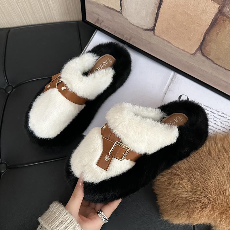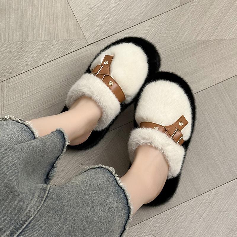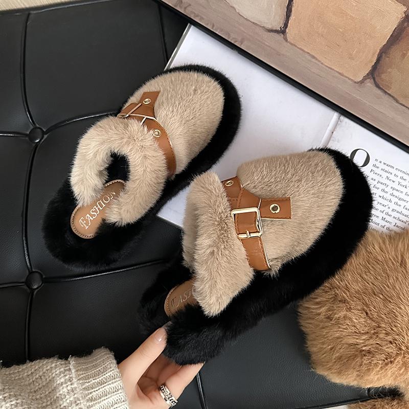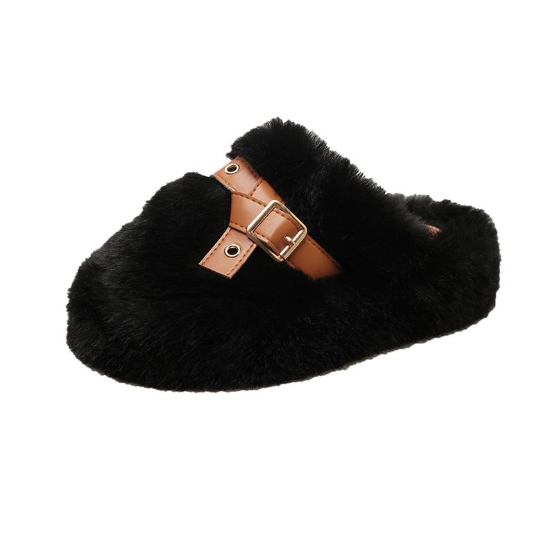 Модные женские пушистые тапочки с металлической пряжкой, пушистые зимние тапочки, зимняя женская обувь на толстой подошве, утолщенное плоское пальто, плюшевые тапочки