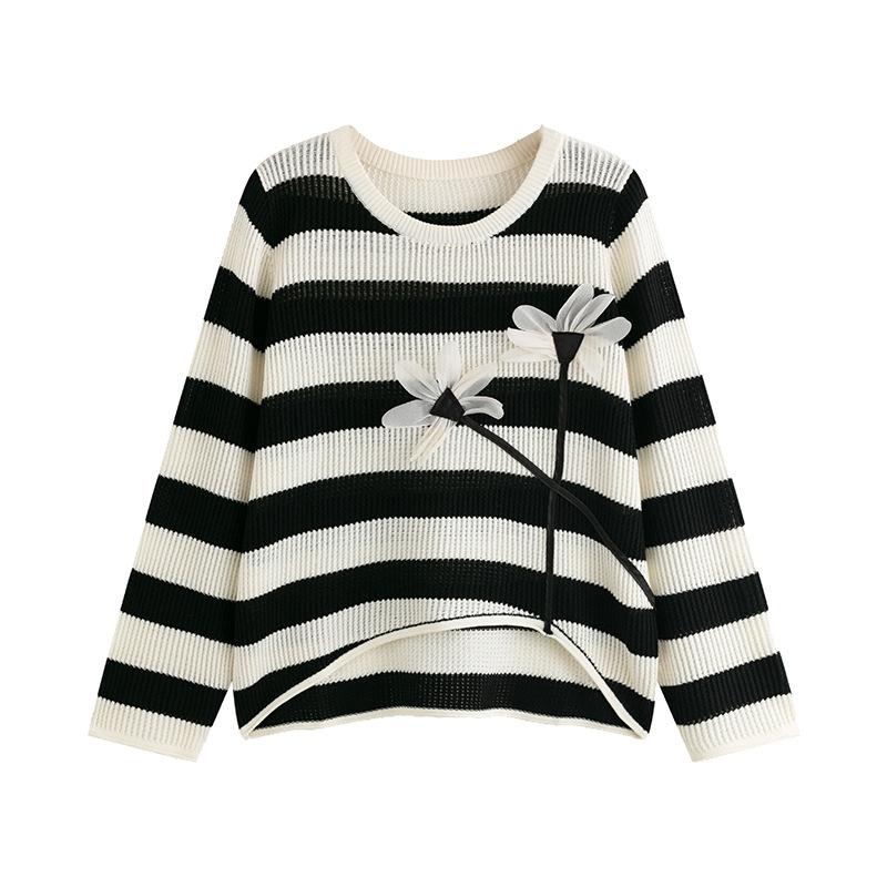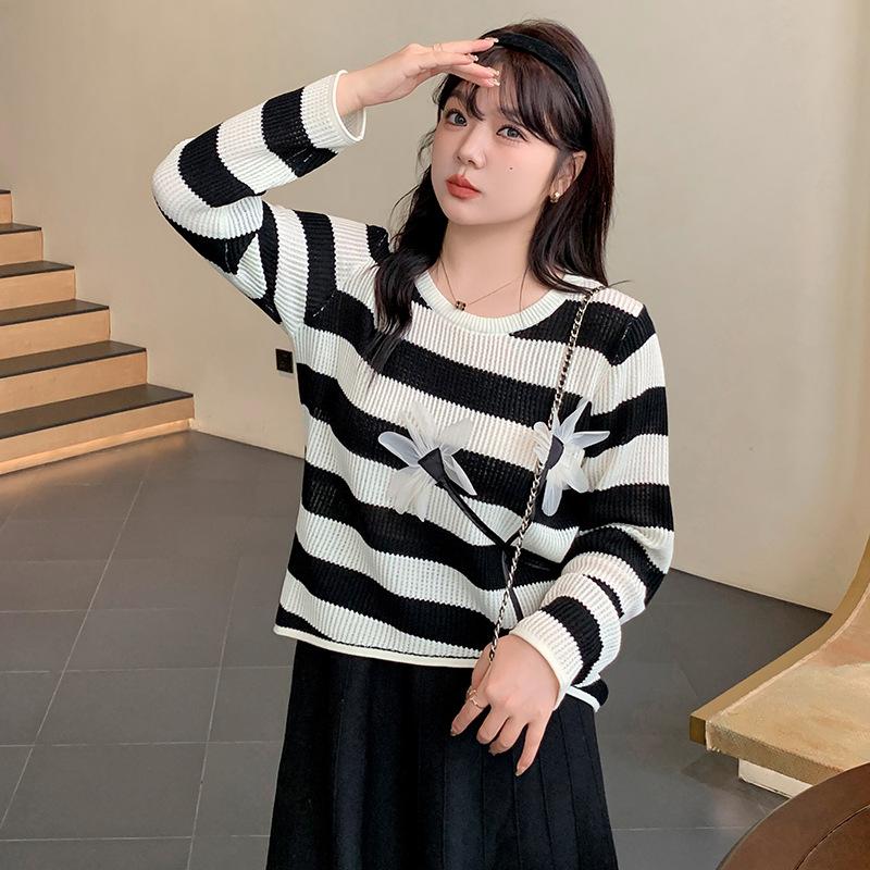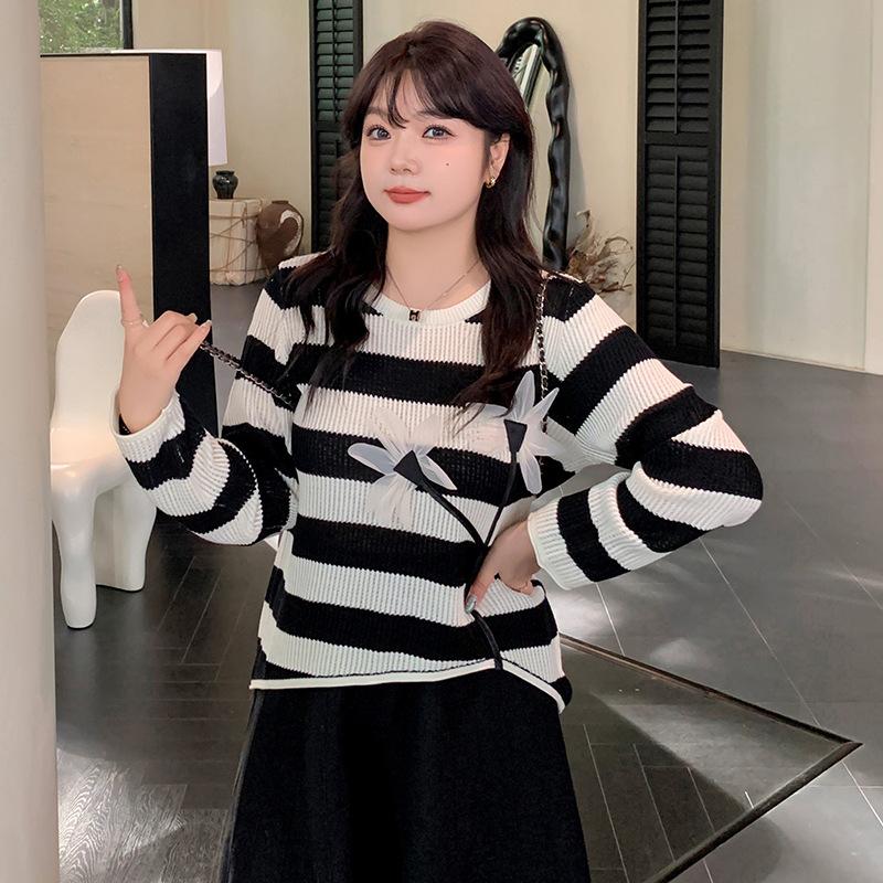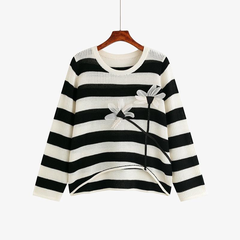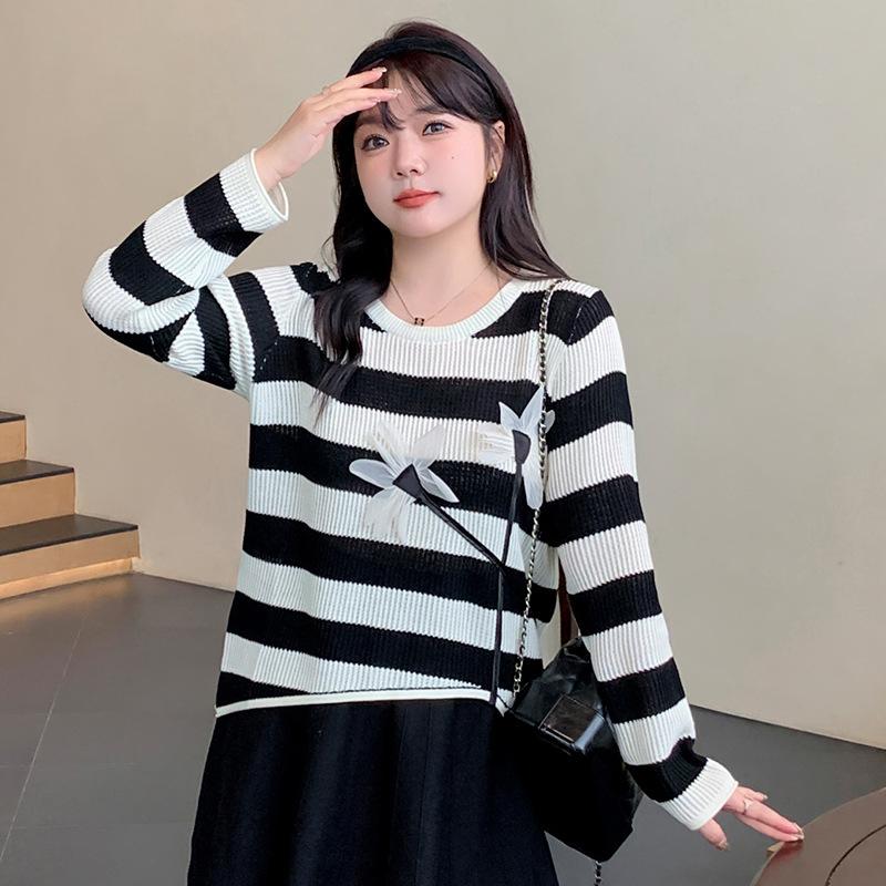 Плюс Размер Женский Стереоскопический Цветочный Длинный Рукав Топ Осенний Полосатый Трикотаж