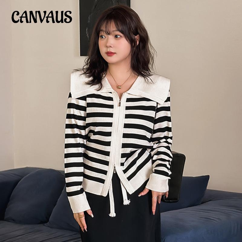 Плюс Размер Женская Осенняя Куртка Темно-Синяя Верхняя Часть Полосатый Длинный Рукав Вязаный Кардиган