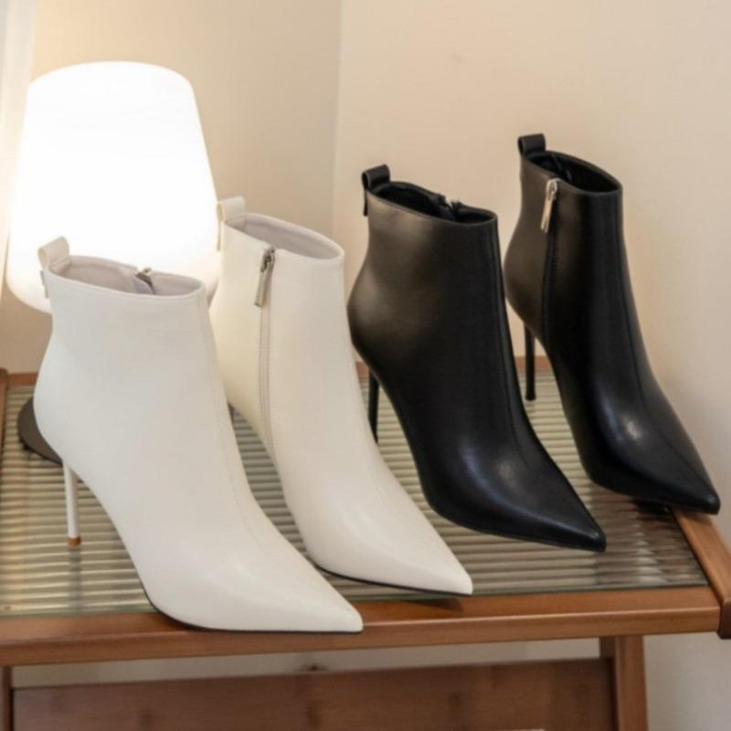 Мода 2024 Новые женские сапоги Модные тонкие высокие каблуки до щиколотки сексуальные заостренные носки на молнии сапоги осень-зима женская обувь белые сапоги