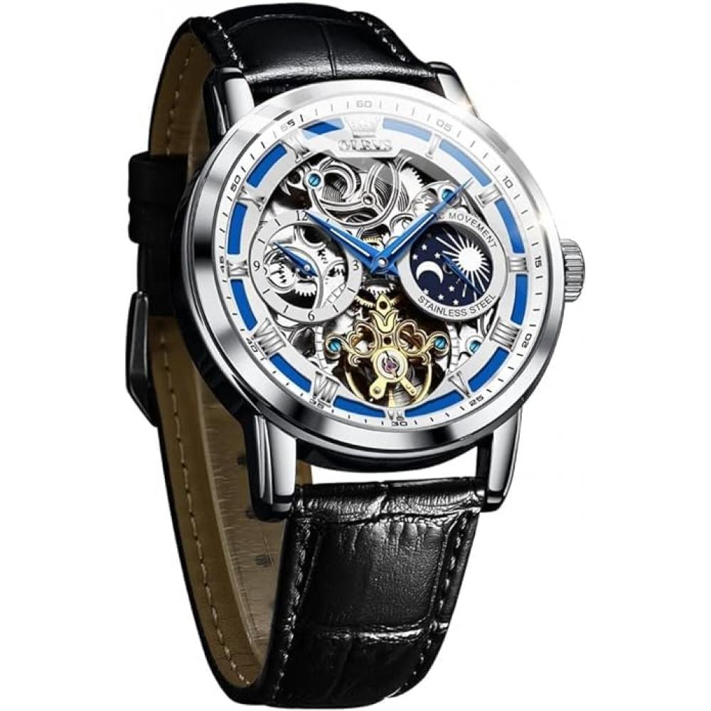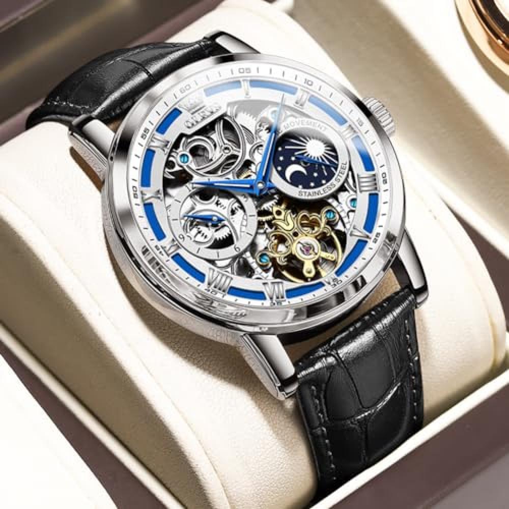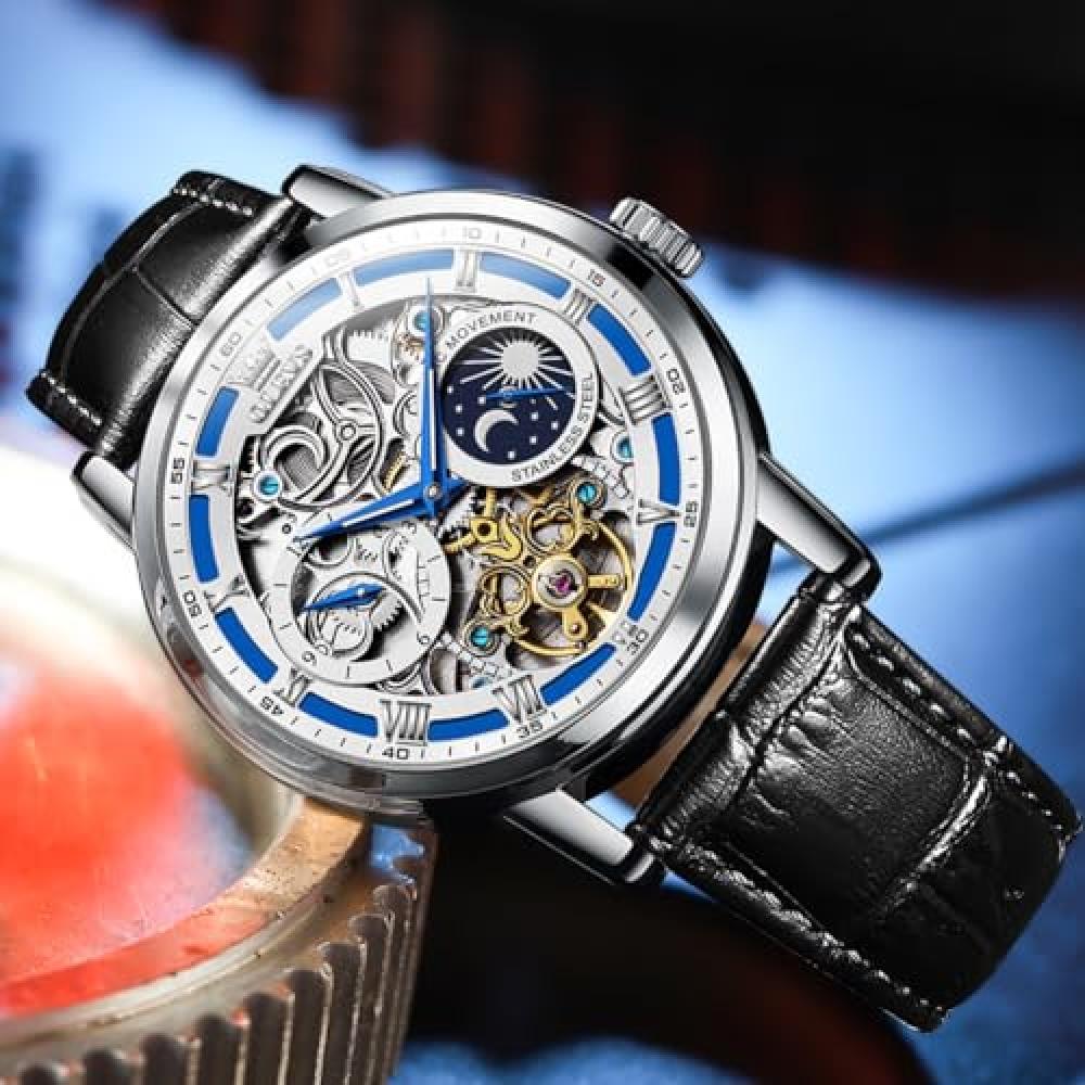 Мужские Мужские Мужские: Скелетонированный механизм, циферблаты с изображением Луны и фаз Луны, шерстяные часы More Sassy для мужчин Задняя часть также имеет скелетонированный дизайн, и вы можете видеть неровный ход часов Temp.