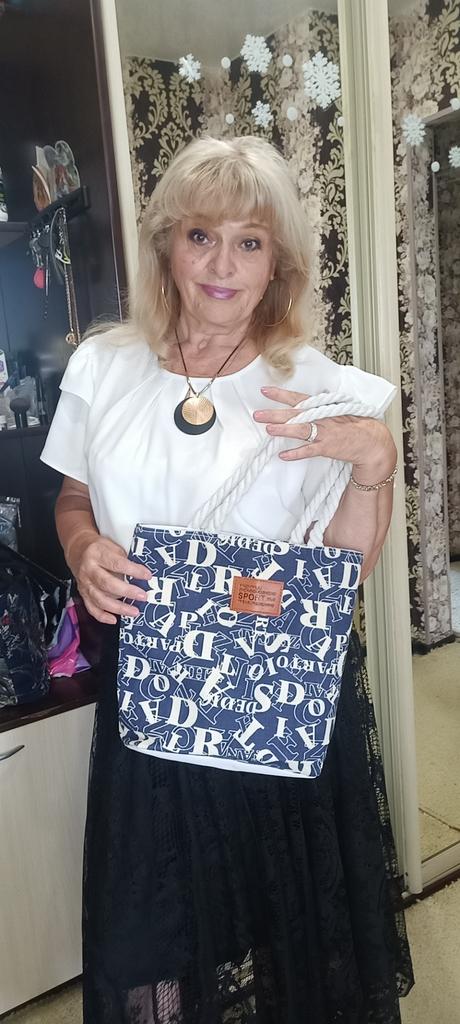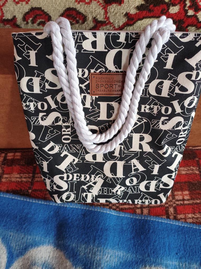 Сумка тоут с буквенным принтом. Вместительная, холщовая, отлично держит форму. Внутри подкладка из ткани синтетика, которая шуршит, с кармашком на замочке. Закрывается сумка замком молнией белого цвета. Ручки из нити скрученные. Прекрасный летний вариант, модная, подойдёт для повседневной носки. Удобная носить через плечо. Цвета разные: бордовая, синяя и черная. Буквы не чисто белые, а кремовые, донышко белое. Размеры в фото. Спасибо Джум. Рекомендую.